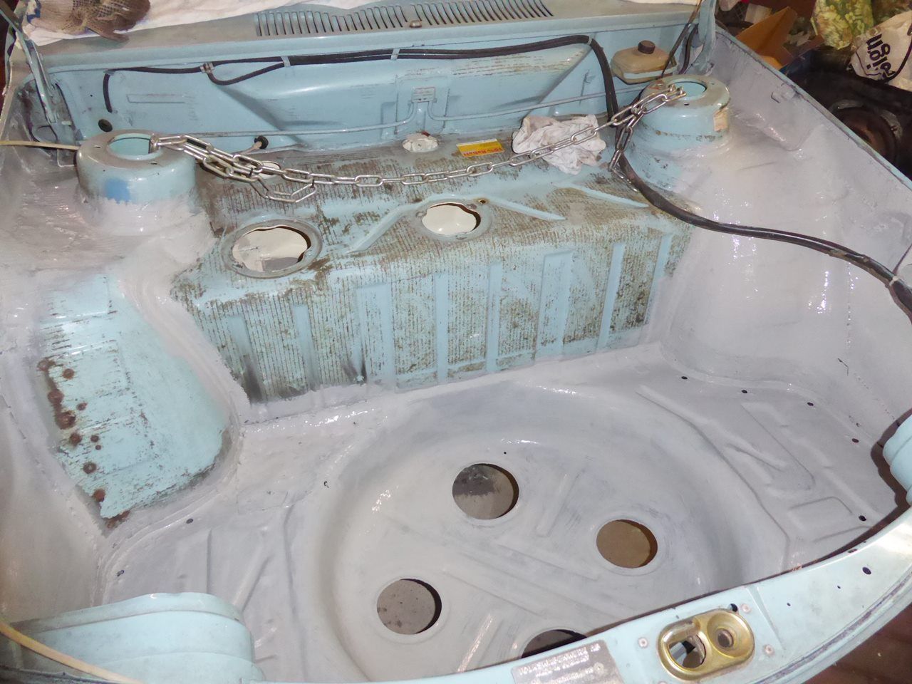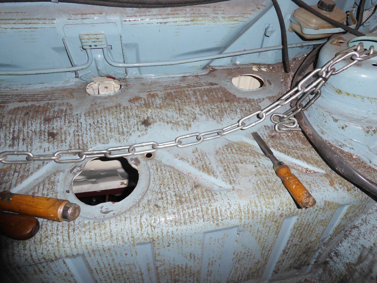Der rechte vordere Längsholm war sehr verrostet. Wir haben im Kofferraum das Deckblech heraus getrennt und den Hohlraum mit verdünnter Phosphorsäure entrostet, anschließend noch Fertan-Rostumwandler drauf, mit Wasser durchgespült und dann mit Fluid-Film vor versiegelt.