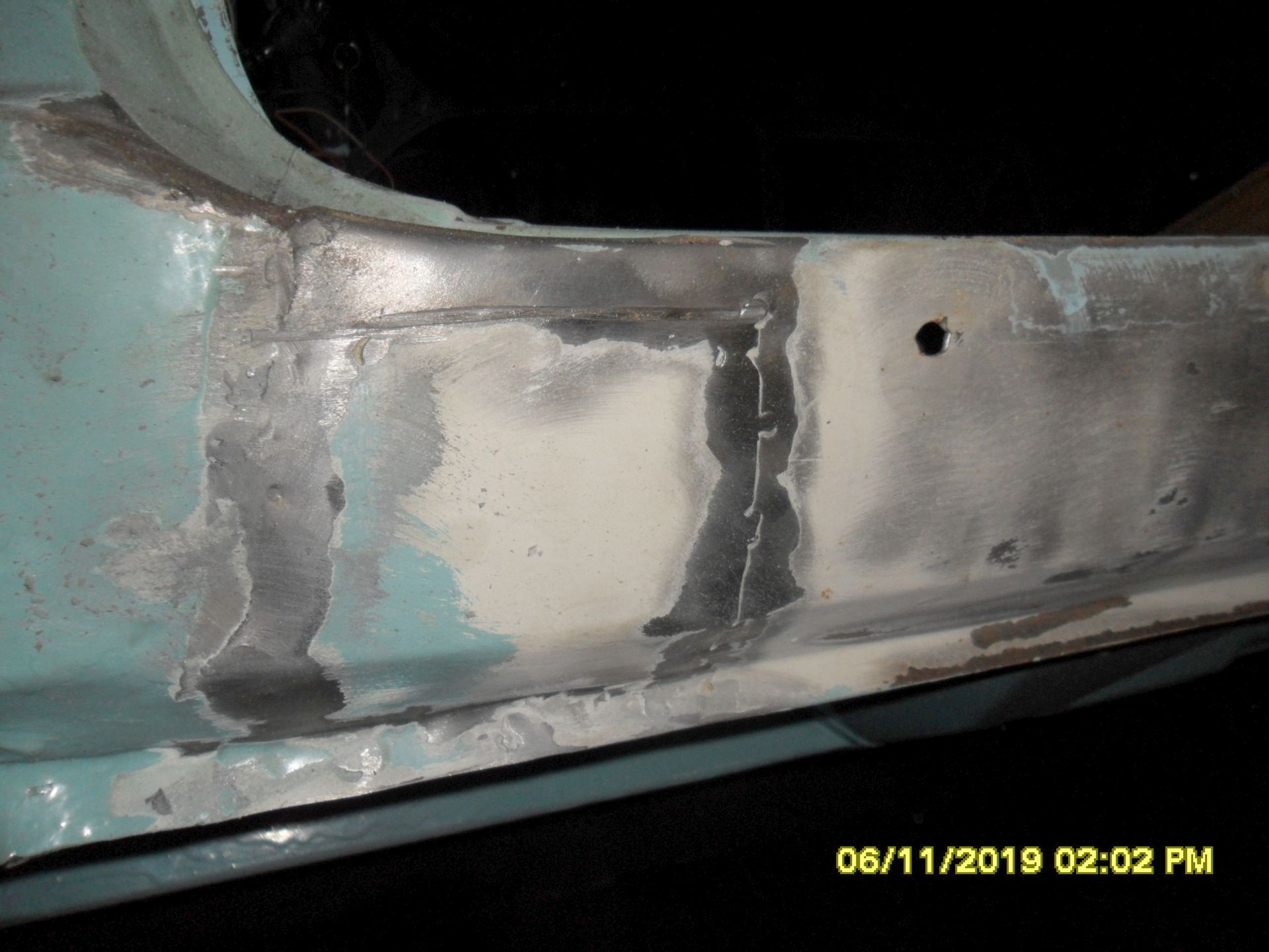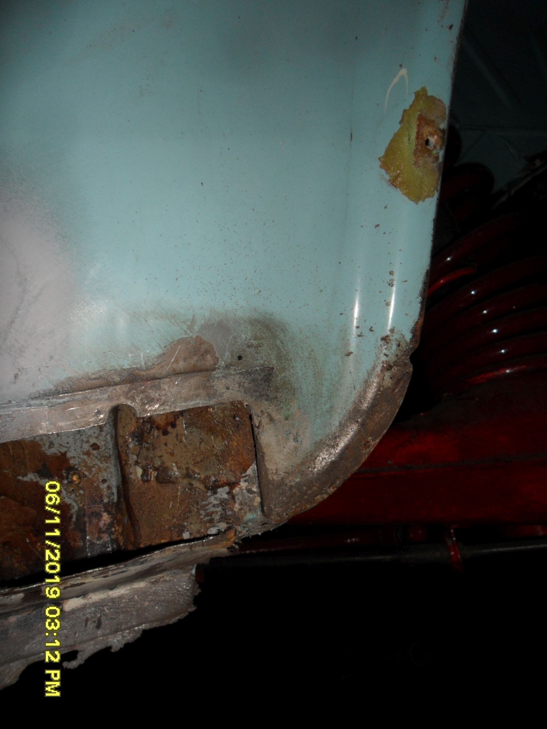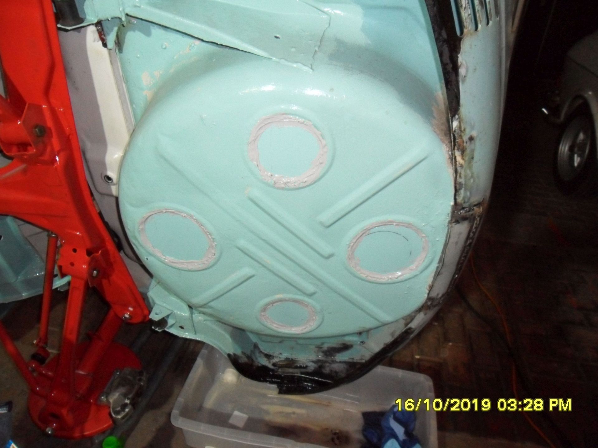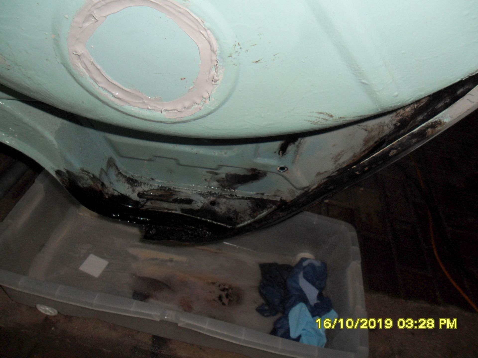 So mussten das Schweller Blech rechts und die Blechverschlüsse der Hohlraumöffnungen links noch nachgeschweißt werden. Der Frischluftkasten vorn erhielt innen eine Epoxygrundierung und ist durch die bewährten Öffnungen im vorderen Kofferraum auch von dort vom Lackierer zu erreichen. Durch diese zusätzlichen Öffnungen ist auch die Scheibenwaschdüse immer wieder von innen (Kofferraum) zu erreichen und man muss nicht Gebläse und Co. ausbauen.