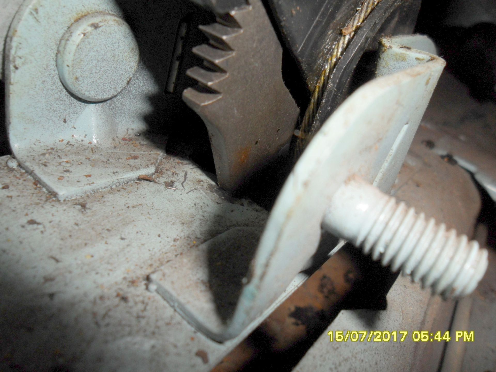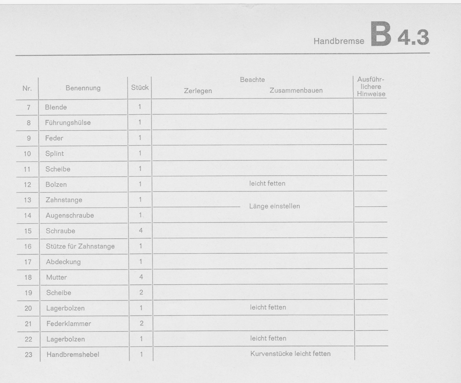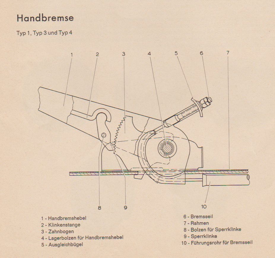 Normalerweise hört man beim Anziehen der Handbremse das „rrrrt“ und die Handbremse sollte ab den 2. Zahn vom Zahnbogen (Pos. 11 - Bildtafel A 52) Wirkung zeigen. Aber nicht bei unserer „Lotta“. Die Handbremse lief leer, kein Rastgeräusch, keine Bremswirkung. Nach der Schrecksekunde bleibt dann nur noch die Fußbremse zum Halten oder man muss die Handbremse mit der rechten Hand hochgezogen festhalten.