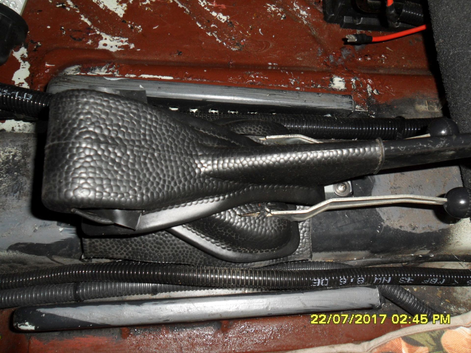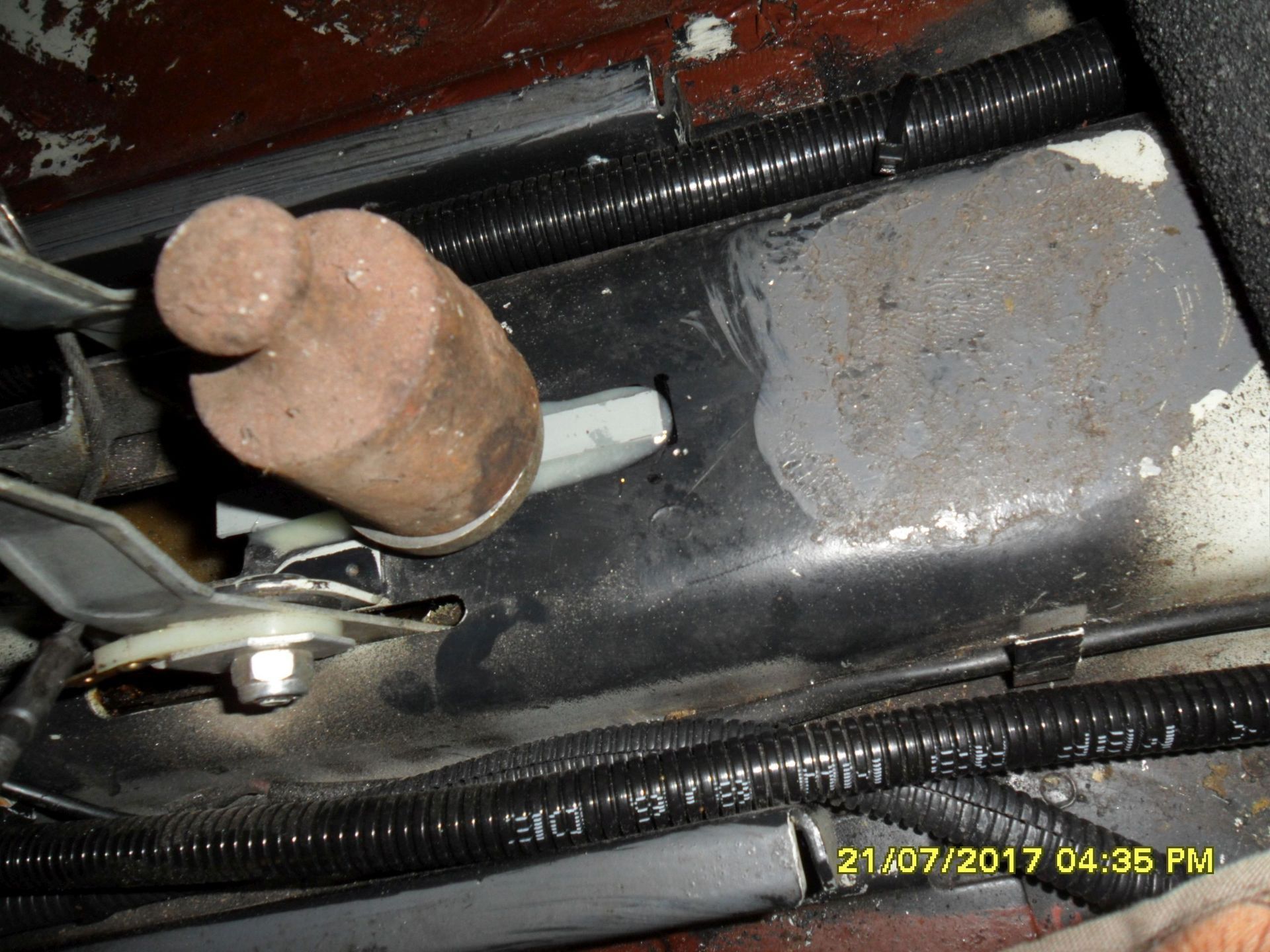Später in unserer Werkstatt habe ich dann festgestellt, dass diese Haltenase total abgeschabt und auch nach unten gebogen war. An sich ist das Mitteltunnelblech im Bereich der Handbremse dickwandig, mindestens 2 mm stark aber durch die jahrzehntelange Bedienung der Handbremse war dieses Blech bei unserer „Lotta“ völlig abgenutzt.