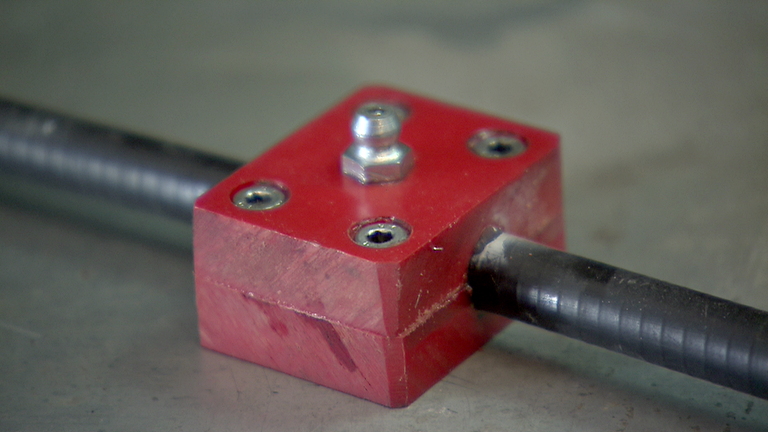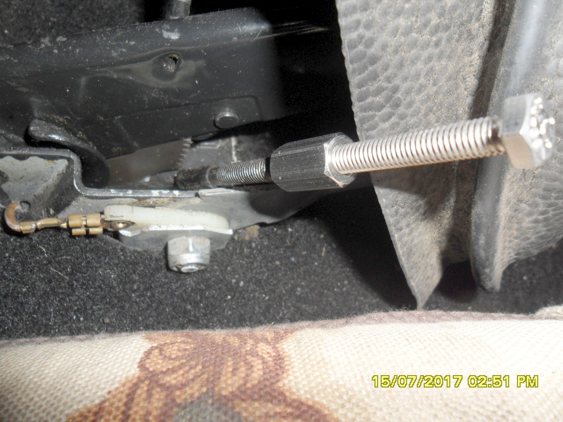 Damit die Handbremsseile nach dem Lösen der Nachstellmuttern nicht in den Mitteltunnel fallen können, habe ich auf dem jeweiligen Gewinde eine Sechskant-Doppelmuffe M 6 x 18 aufgeschraubt und am anderen Ende eine Sechskantschraube M 6 x 40 eingeschraubt (Bilder A und B).