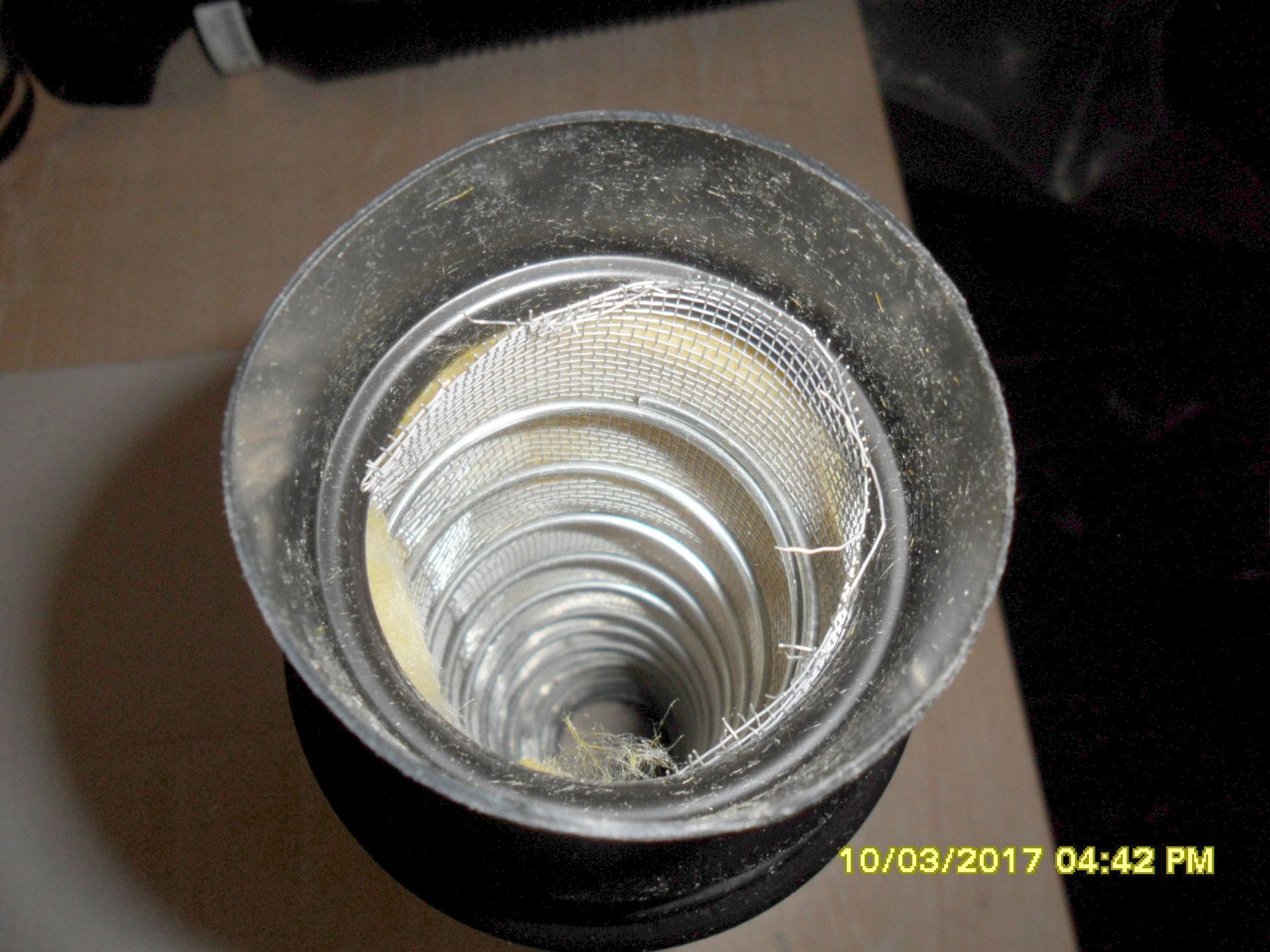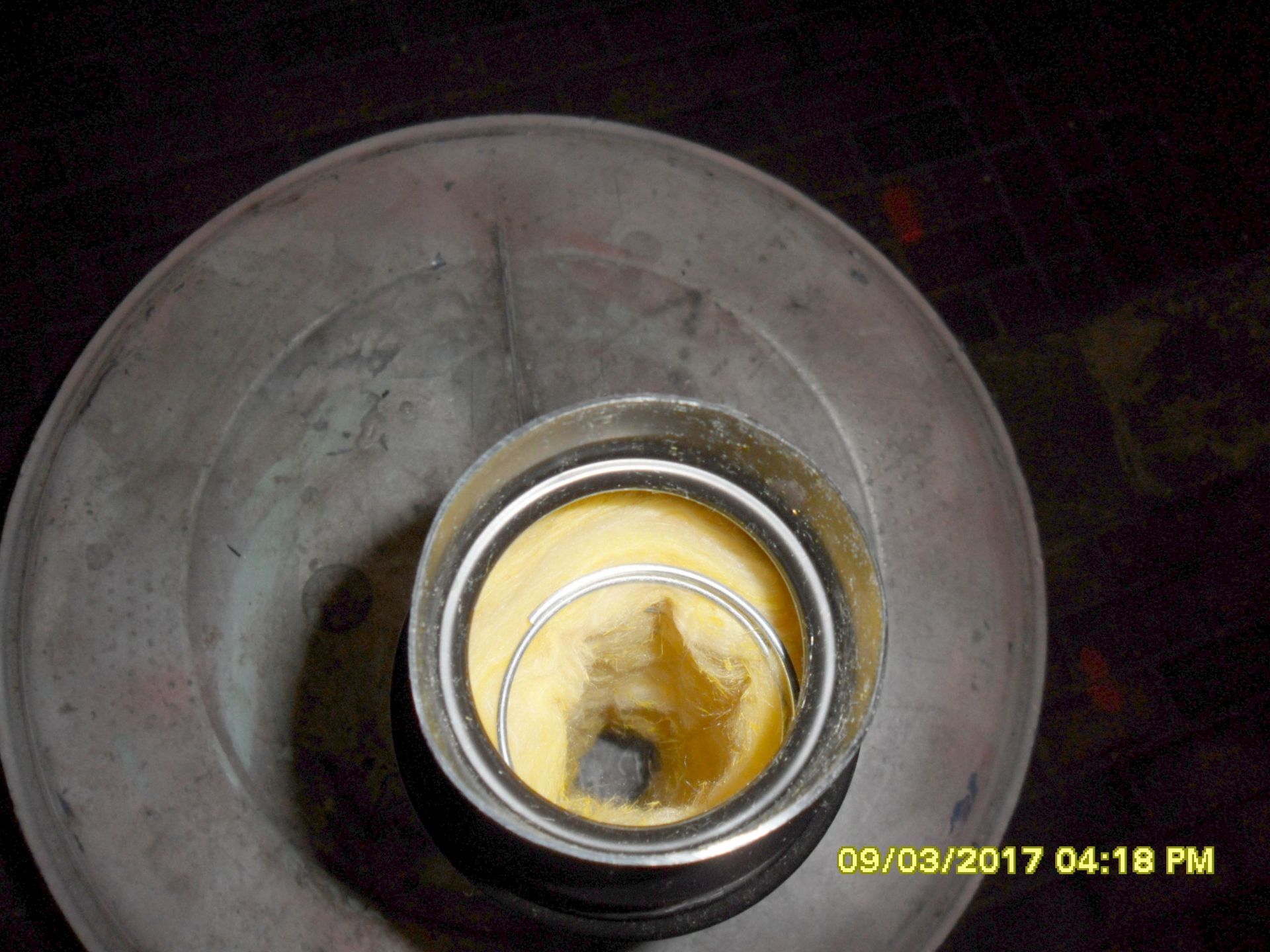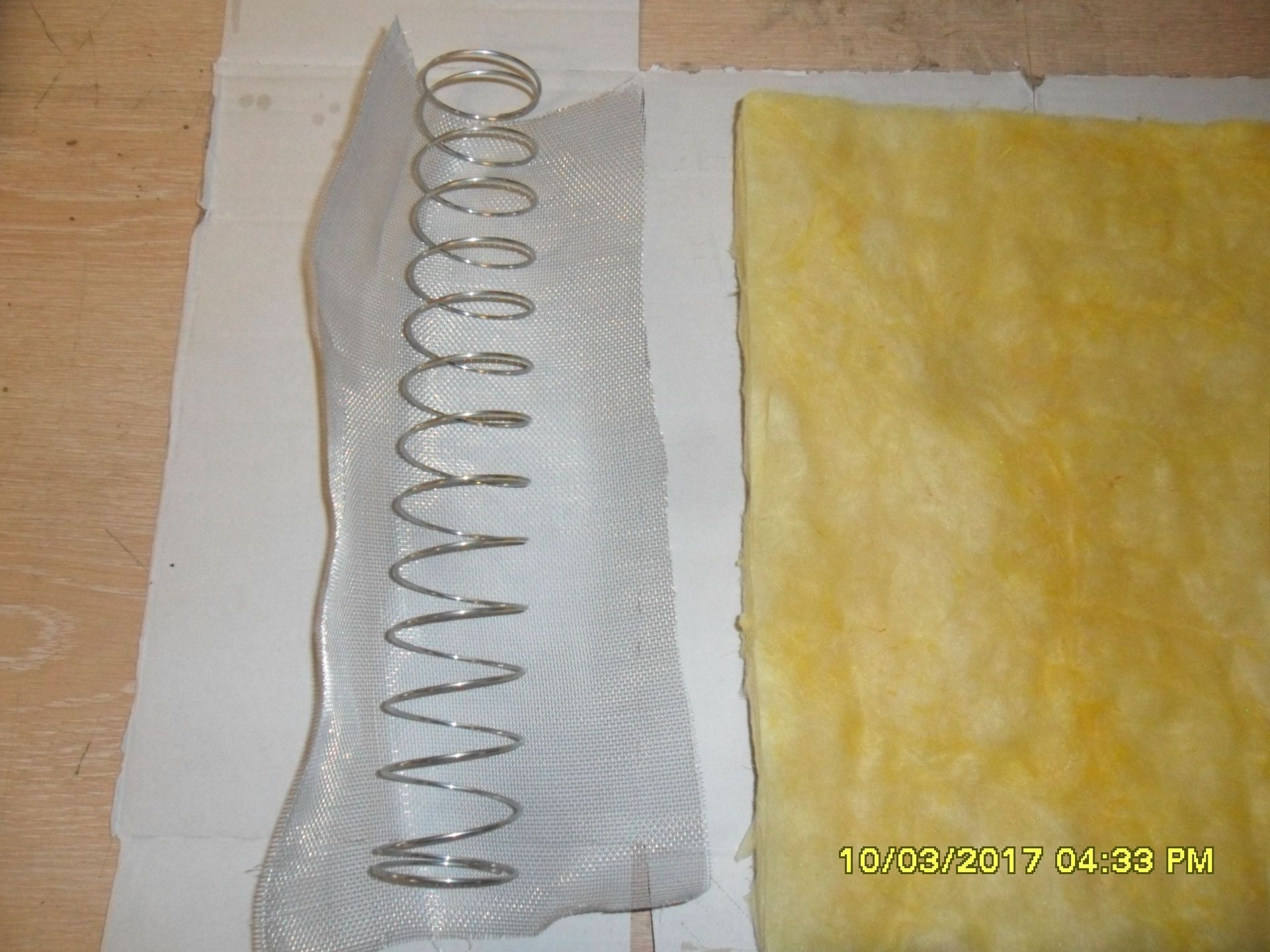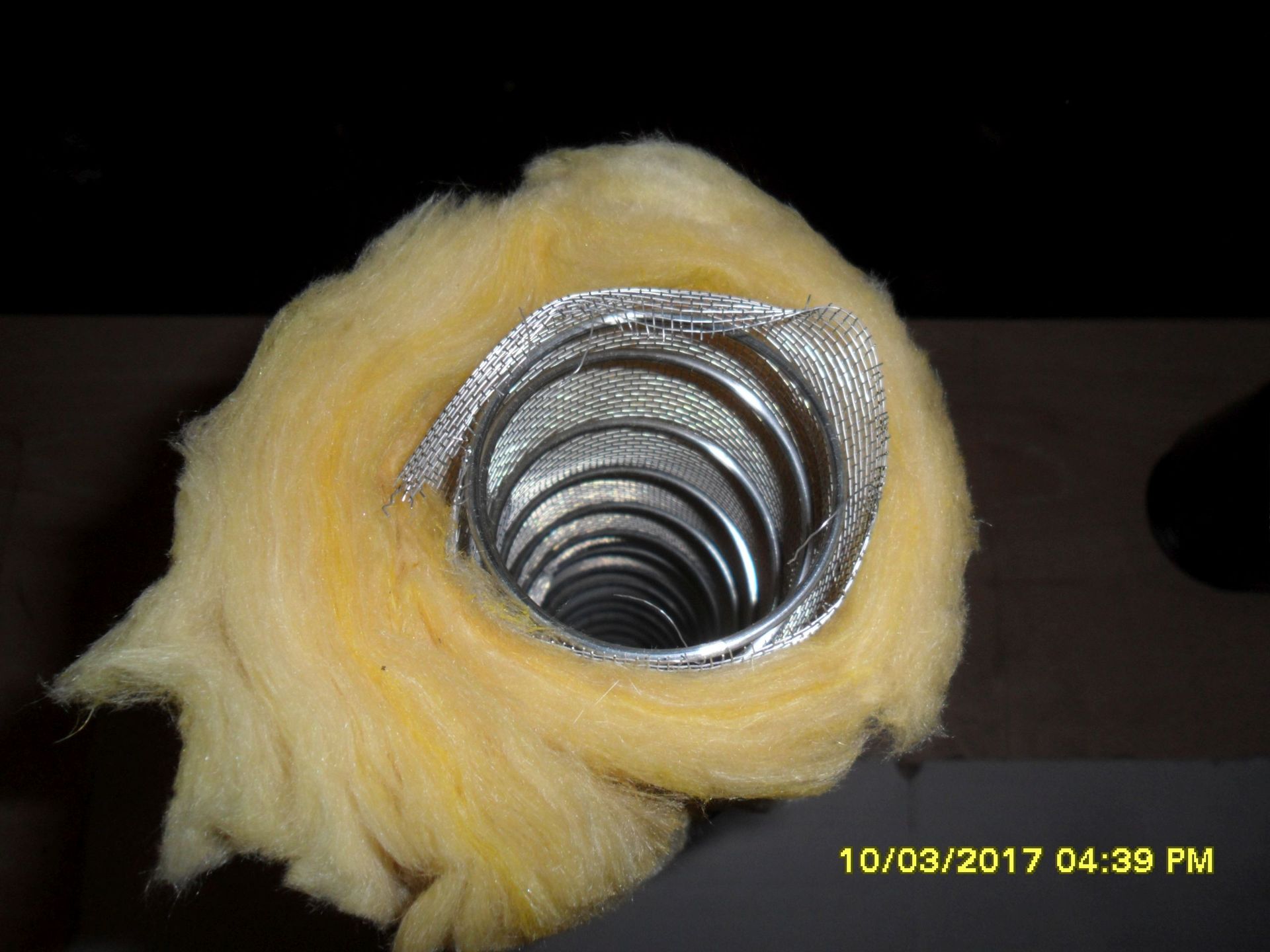 Aber ich konnte wenigstens Teile vom gekauften Schlauch verwenden um einen funktionierenden „Warmluftschlauch“ herzustellen, der auch tatsächlich Wärme durchlässt. Ich habe dazu den Warmluftschlauch zerlegt und um die Drahtspirale ein Fliegengitter aus Edelstahl gewickelt (gibt es im Baumarkt für kleines Geld) und mit Kabelbinder (Länge 200 mm) gesichert. Dann habe ich mit dem Glasfasergewebe den Drahtkern umwickelt und in das längere Rohrstück gesteckt. Wenn man den Dämmkern leicht in Wickelrichtung dreht, lässt sich dieser problemlos in die Kunststoffhülle hineindrehen. Auf dem herausstehenden Dämmkernende wird dann das verbliebene Rohrstück hineingedreht und so verschraubt.