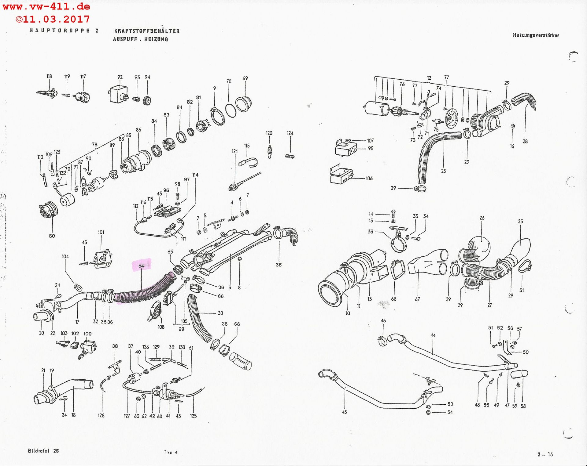 Der "Warmluftschlauch" Nr. 64 auf der Skizze, ist in Wirklichkeit ein Schallschutzschlauch. (VW-Teile-Nr. 411.261.707 (725 B/C). Schließlich sollen die Motor- bzw. Gebläsegeräusche nicht durch den Heizungskanal nach vorn in den Innenraum befördert werden. Ok, es werden nicht alle Motorgeräusche gedämmt, das ist vielleicht ein Nachteil der Luftkühlung bei unseren Nasenbären.