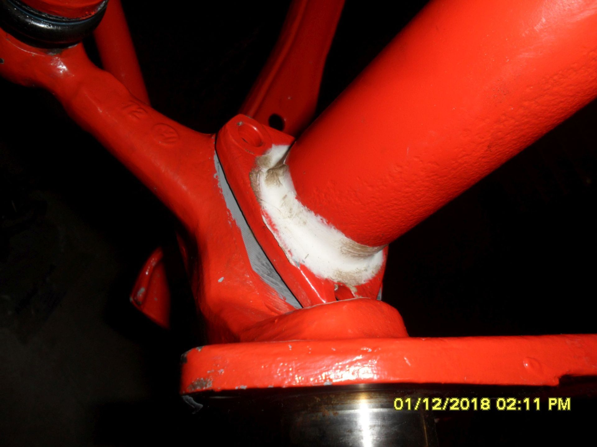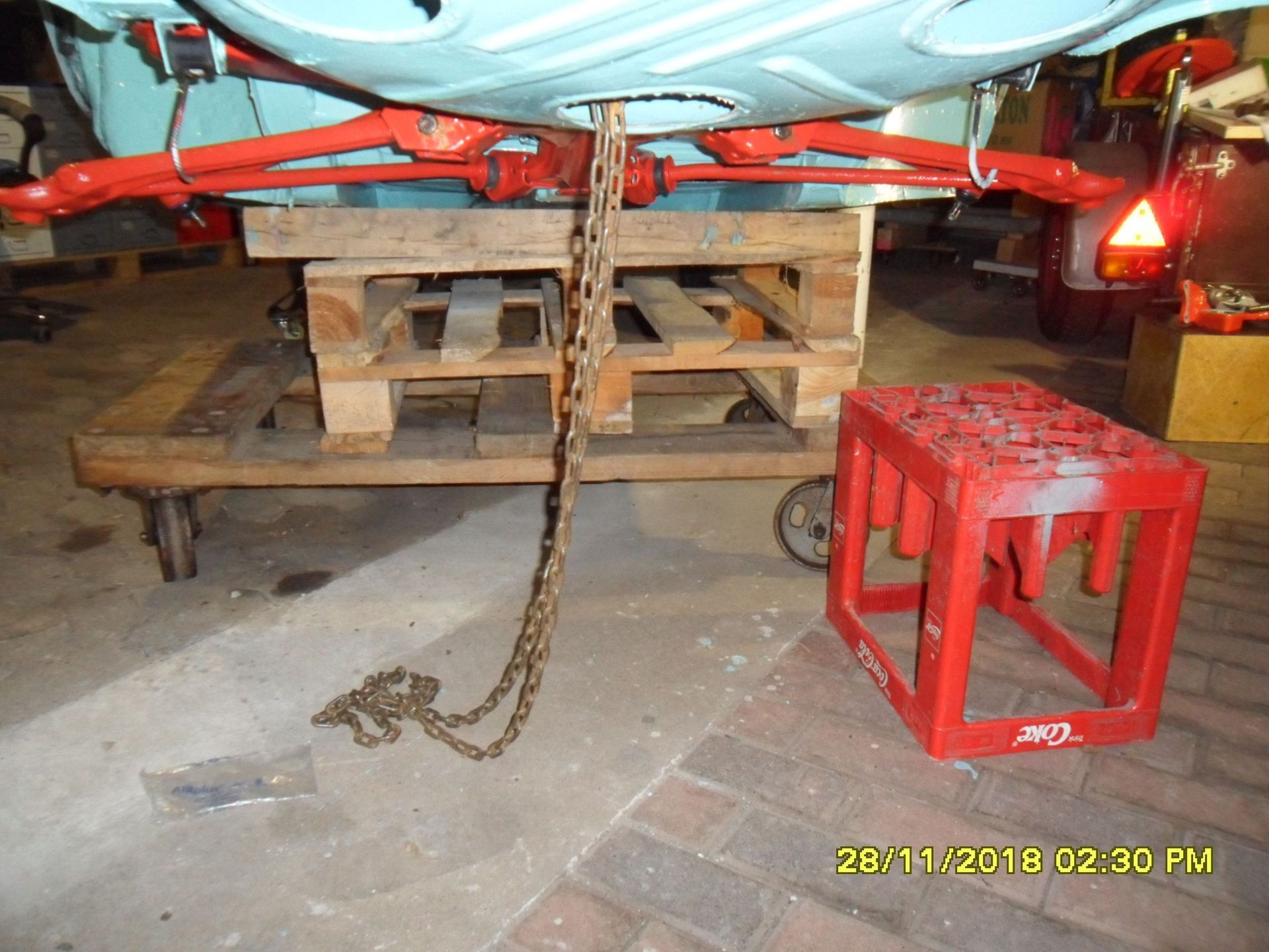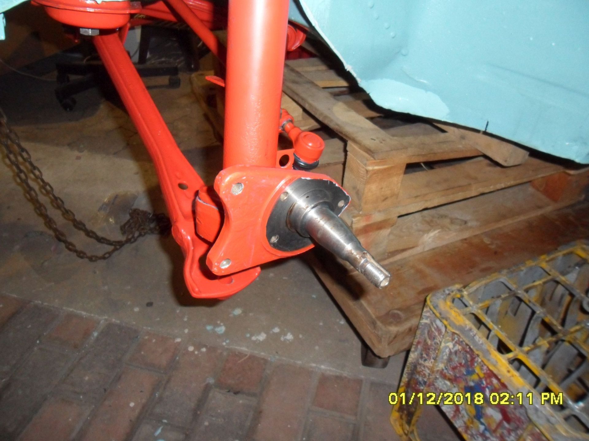 Der Vorderachsträger und die Querlenker lagen bereits einbaufertig im Ersatzteillager. Lediglich musste noch die Lackierung angepasst werden in RAL 3000. Der Träger wurde vor Jahren bereits gestrahlt, sprühverzinkt und grundiert. Im Hohlraum erhielt er eine Vorversiegelung mit Fluid-Film. Später kommt noch Mike Sander´s Fett dazu.