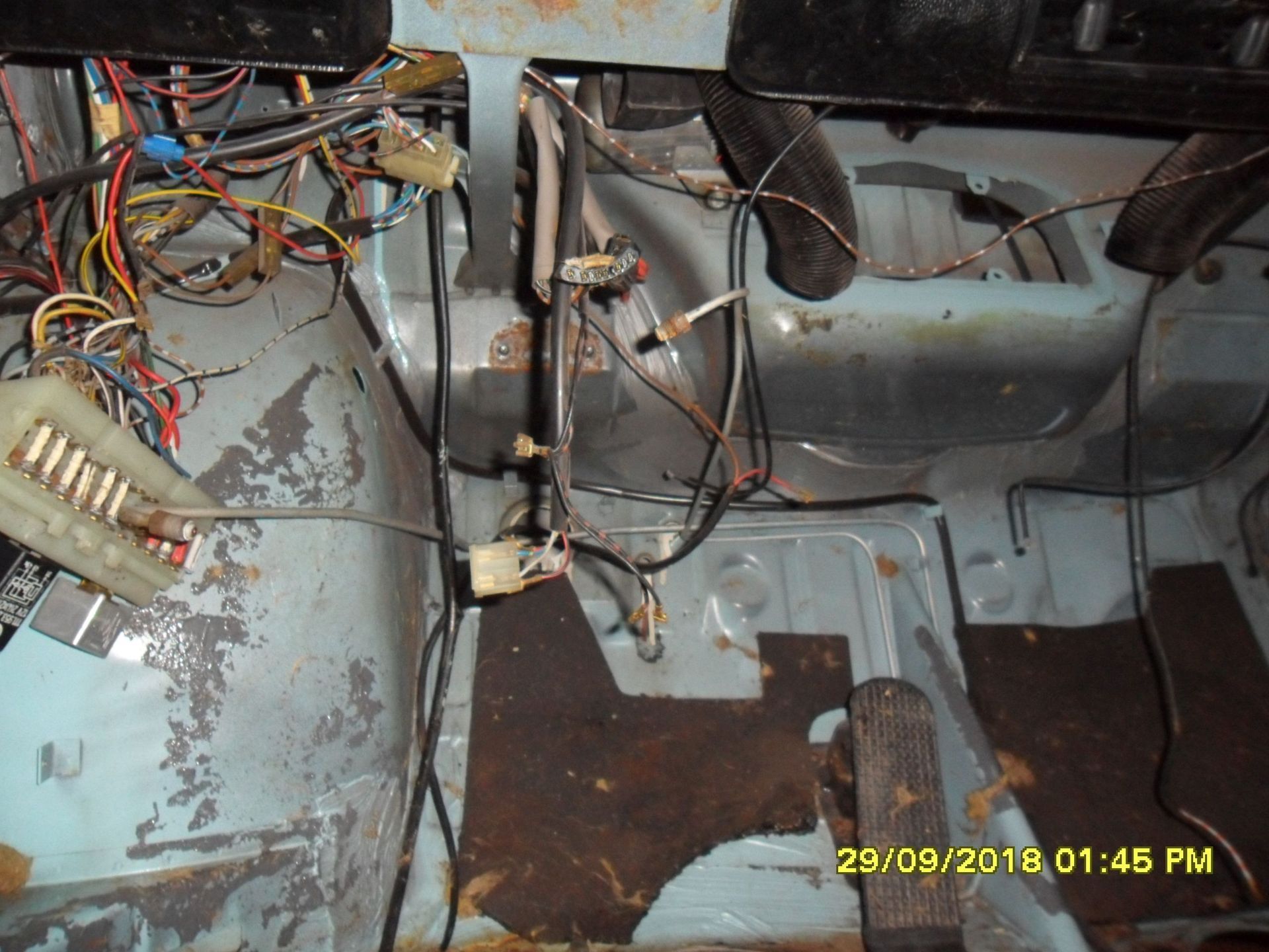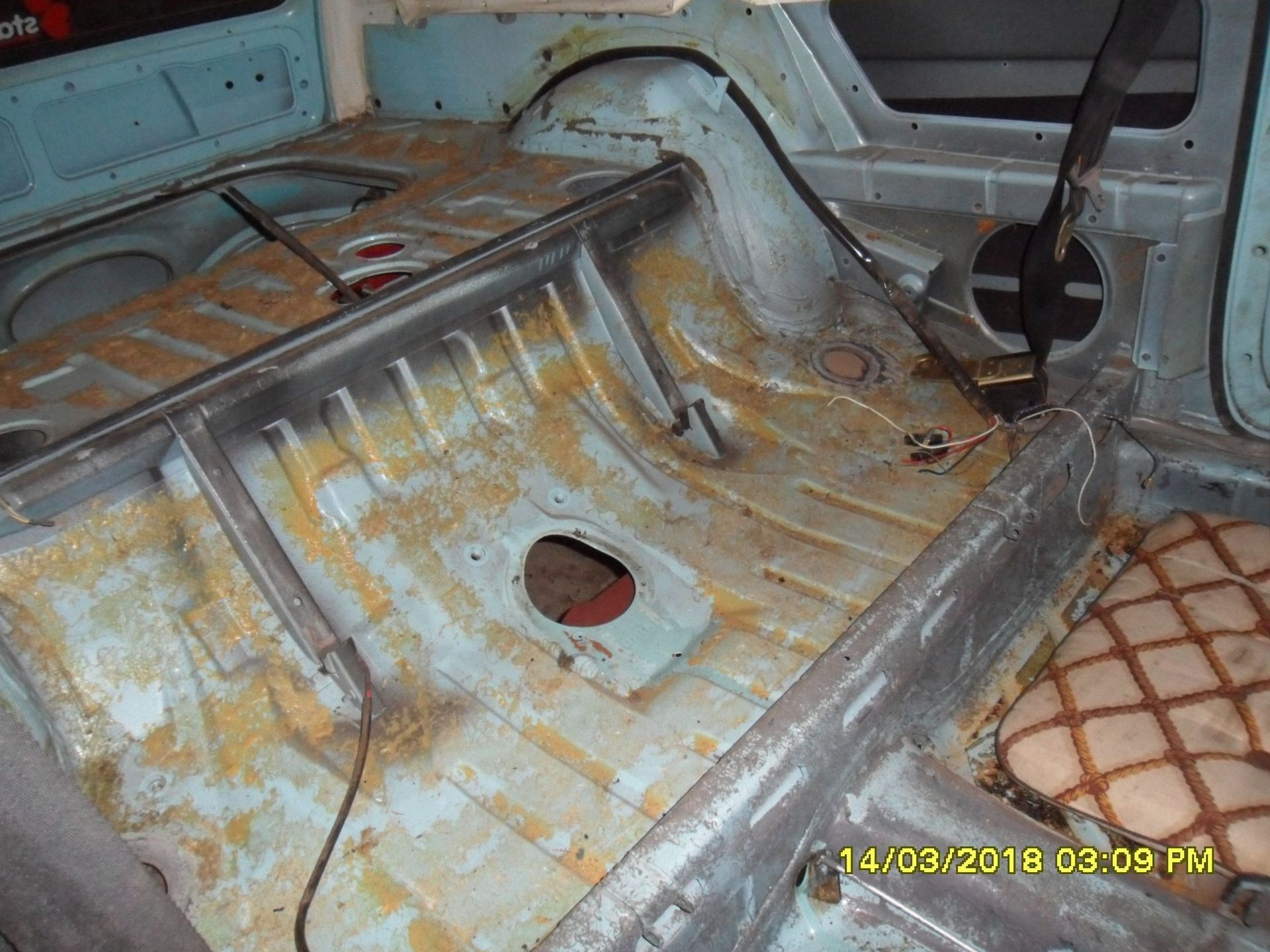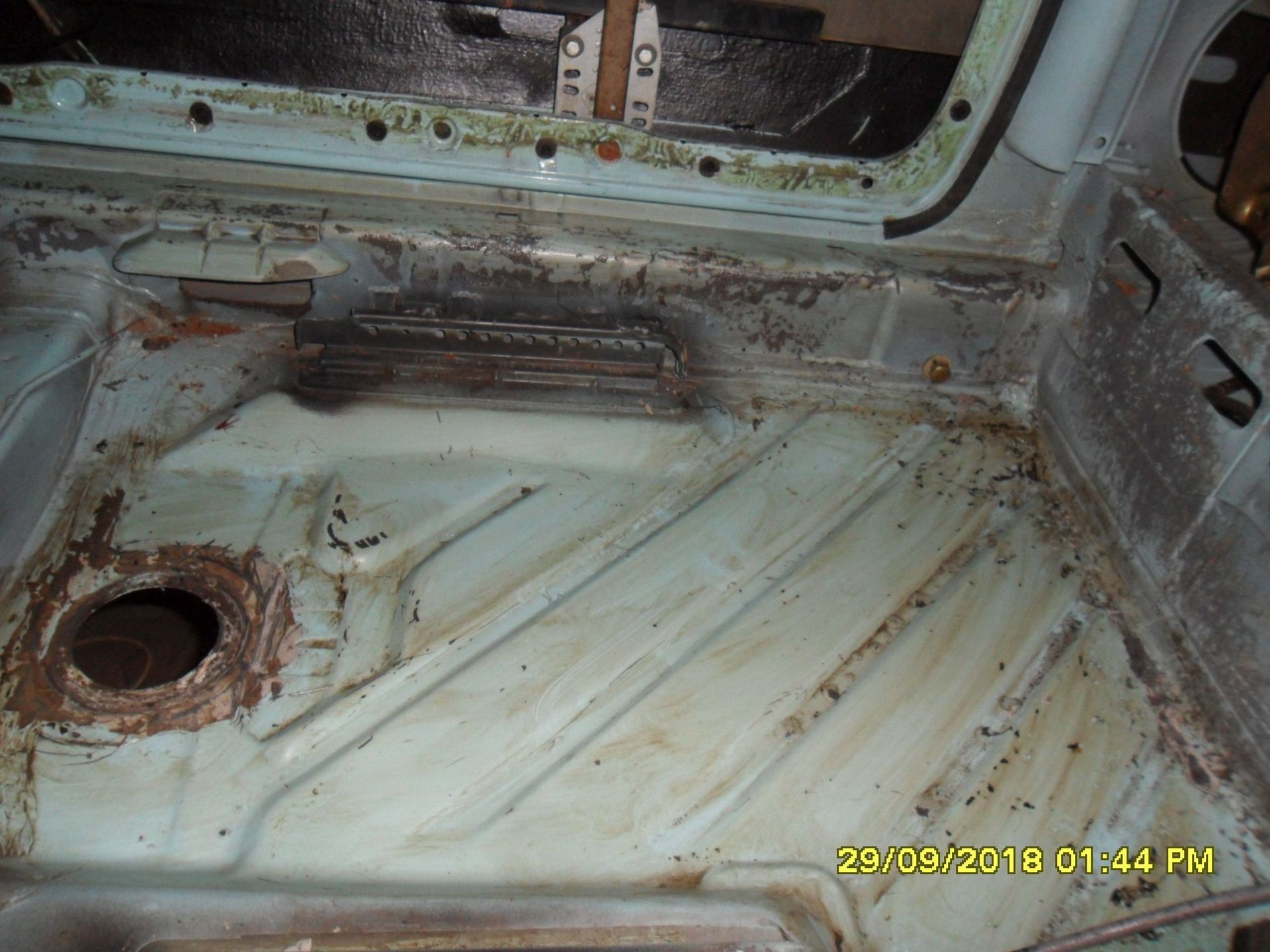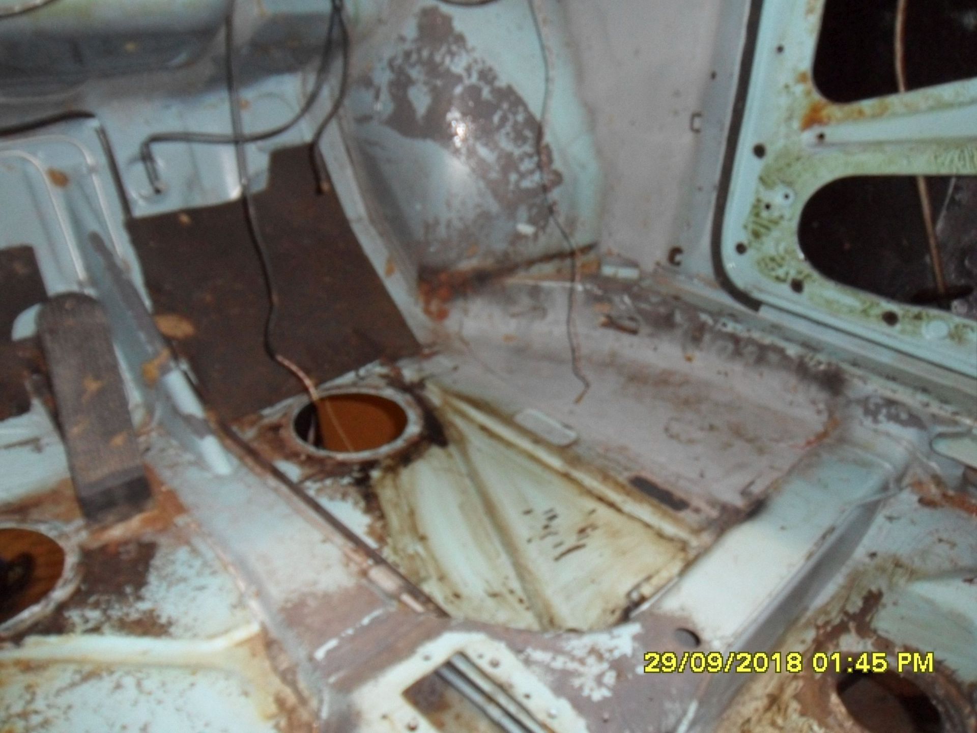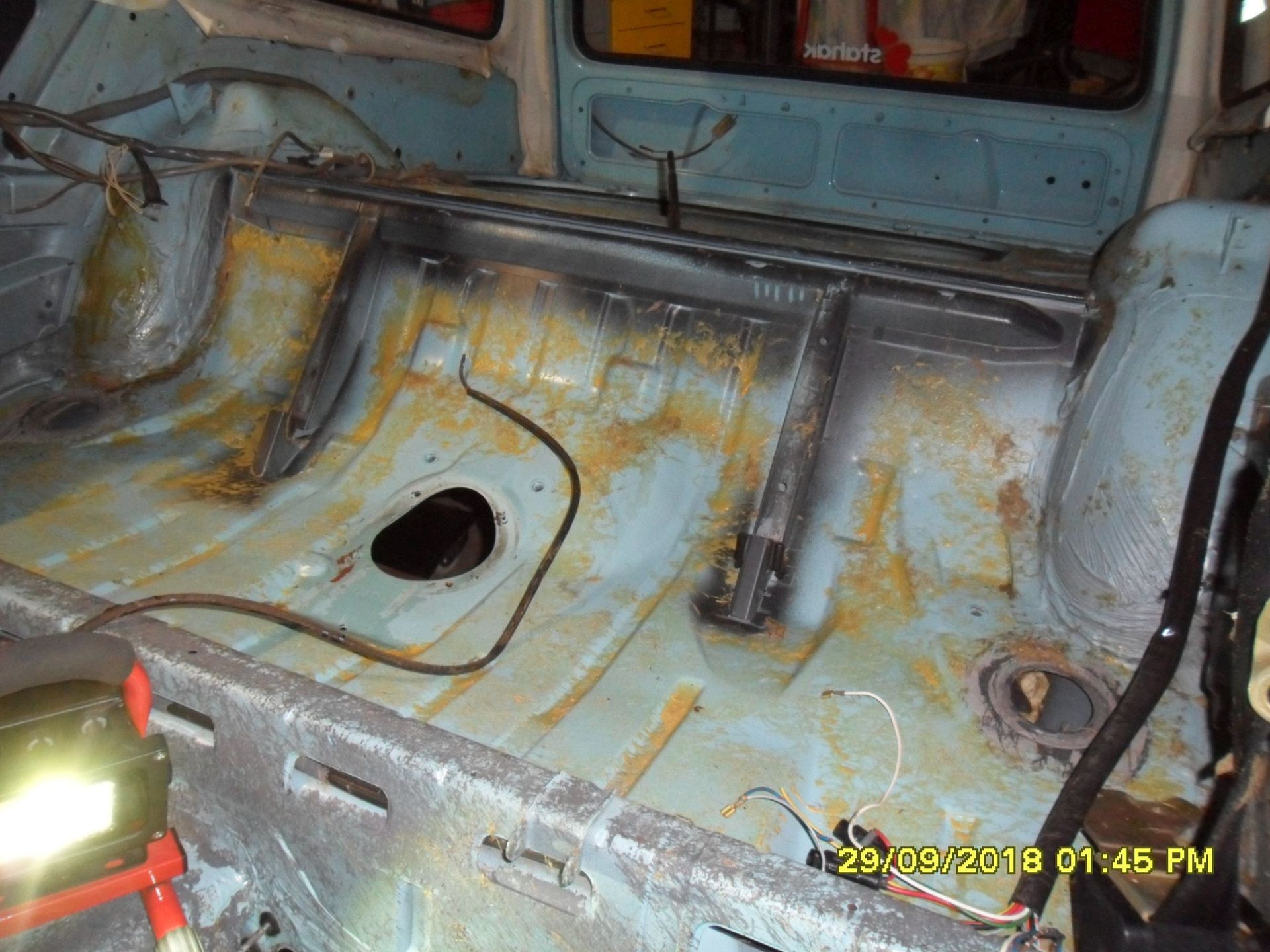 Im Innenraum haben wir nach einer gründlichen Hochdruckwäsche angefangen die Teppichreste und die Bitumendämmung zu entfernen. Außerdem erfolgten erste Entrostungen per Elektrobürste.