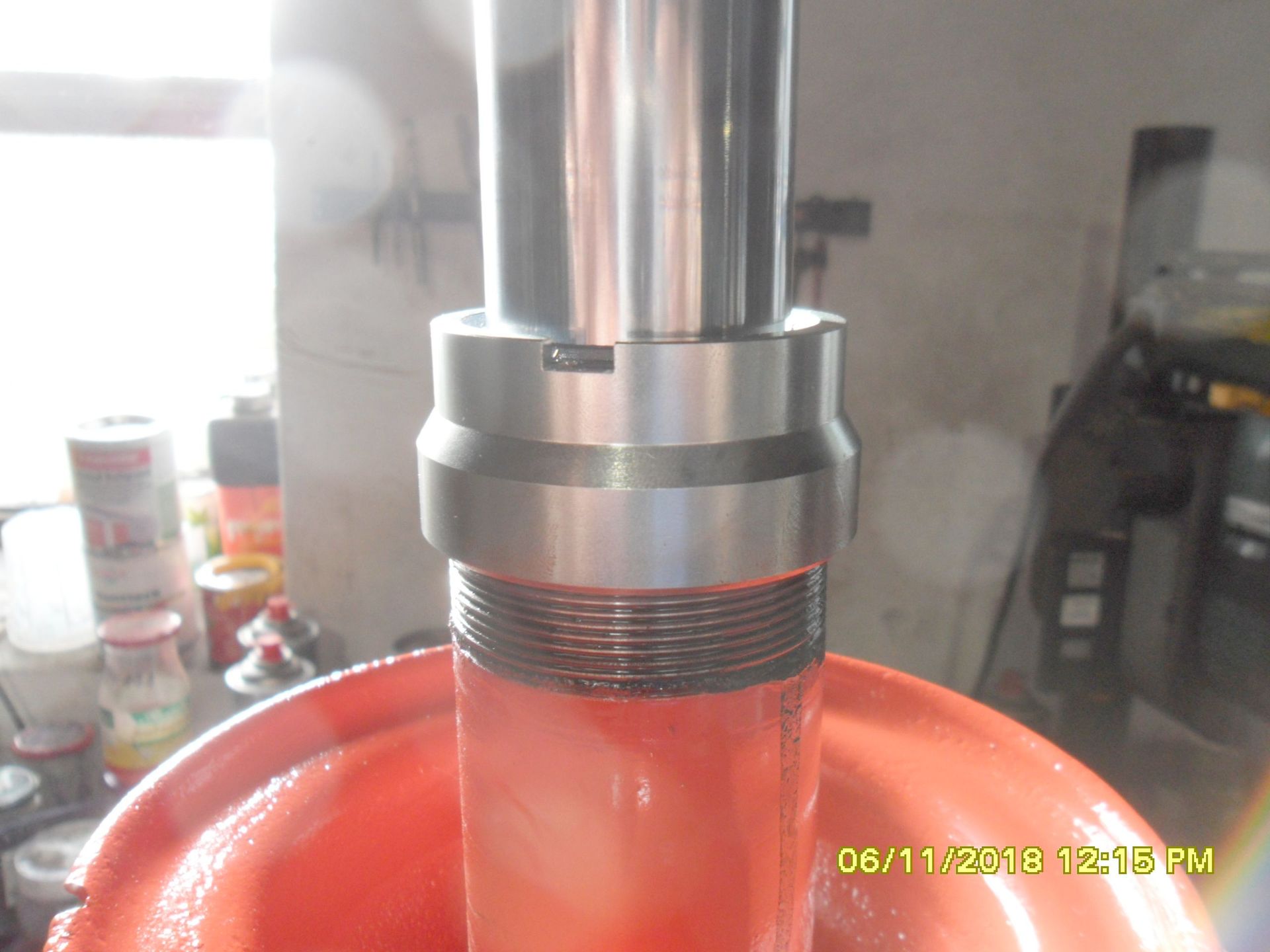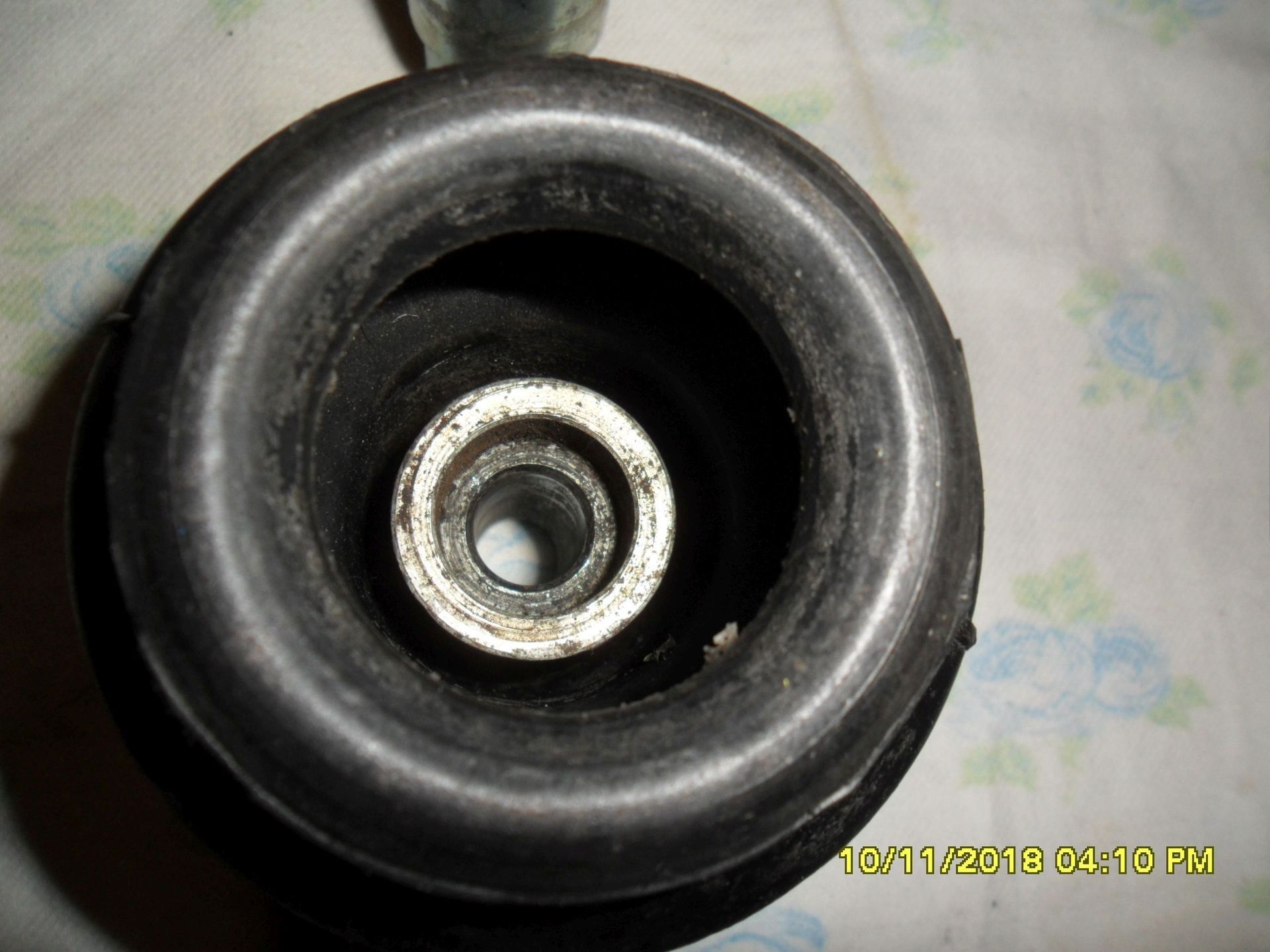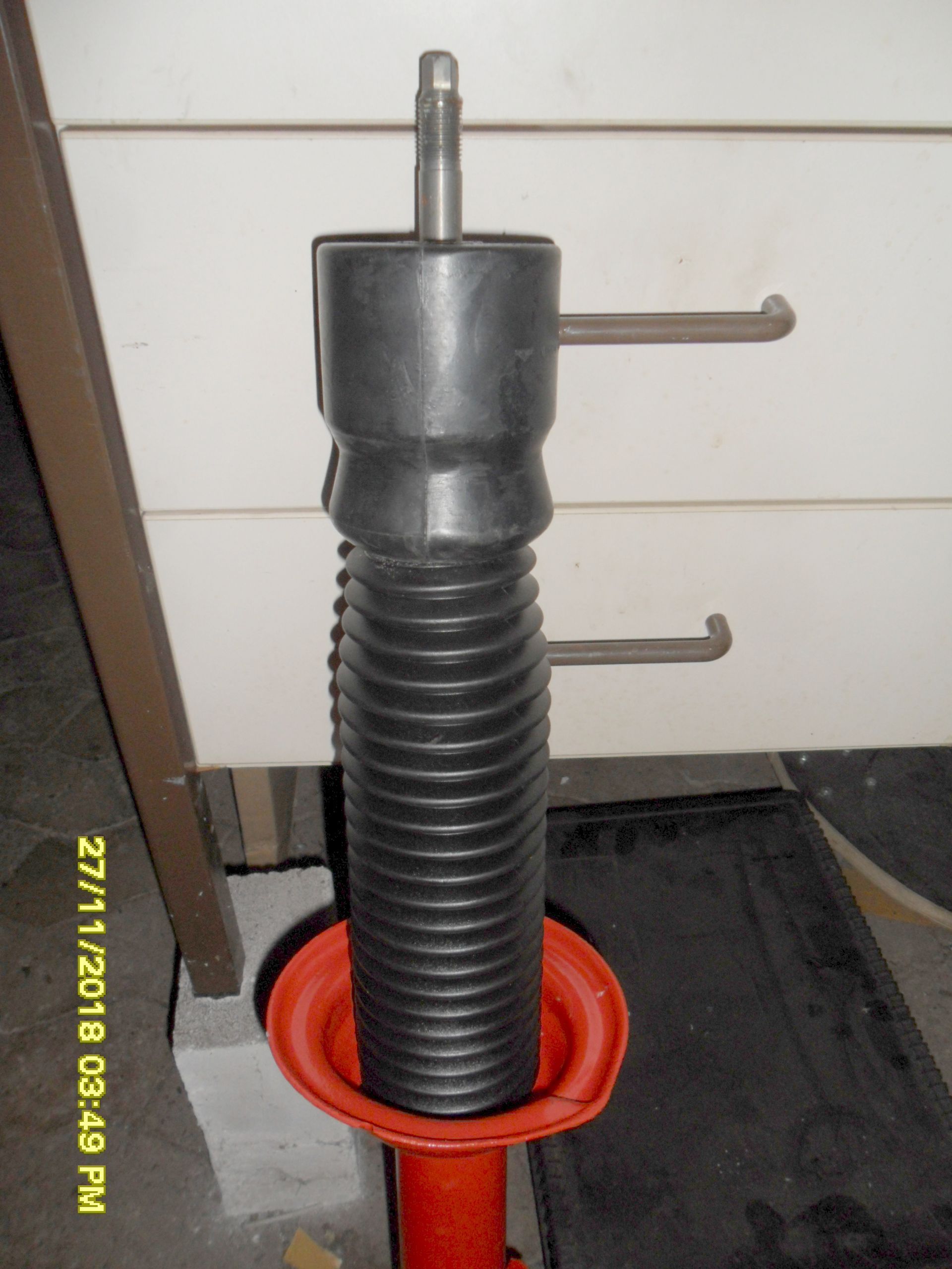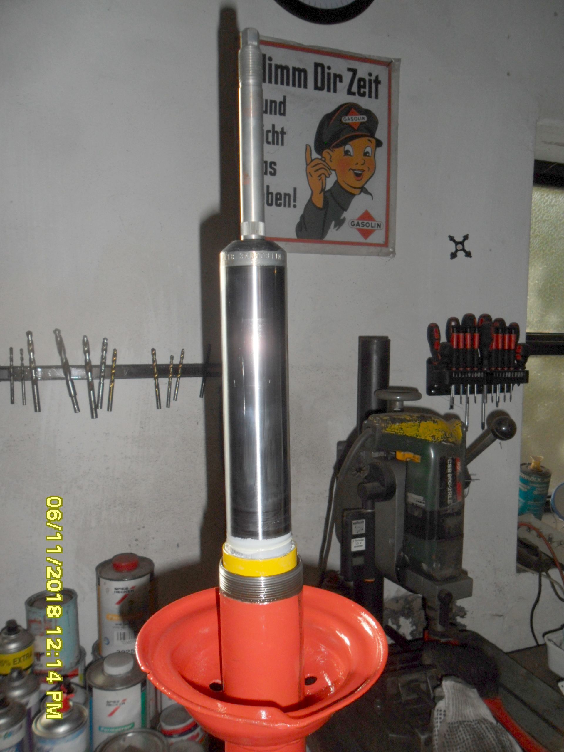 Der in den nachfolgenden Bildern verwendete Schmiernippel wird nur bei der späteren Demontage des Führungsgelenkes benötigt. Über den Schmiernippel lässt sich Fett in den Hohlraum spritzen und durch den Überdruck löst sich das Gelenk leichter vom Federbein. Diese Bohrung wird nach dem Federbein-Zusammenbau mit einer kleinen Sechskantschraube M 6 x 10 mm verschlossen.